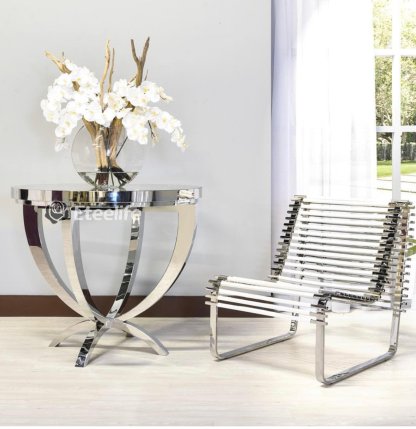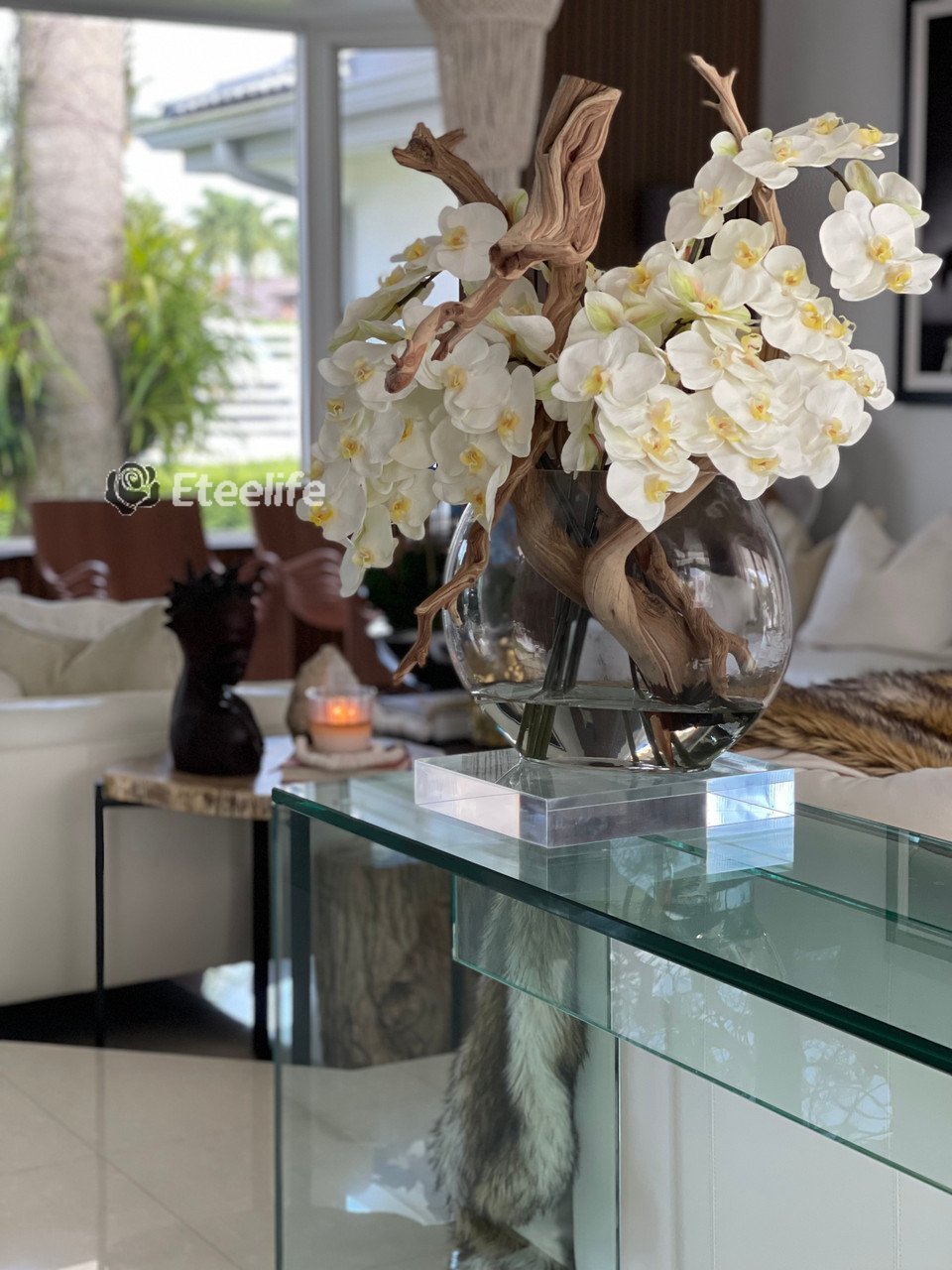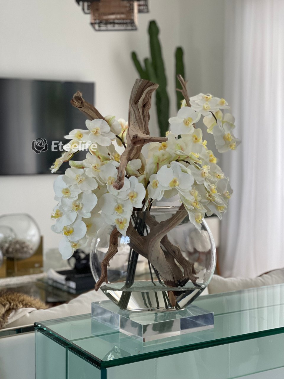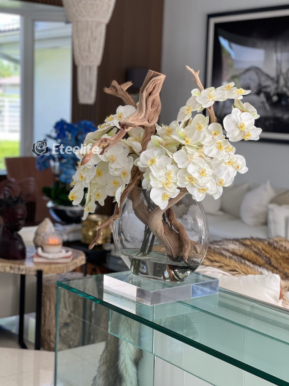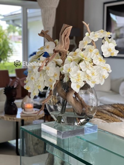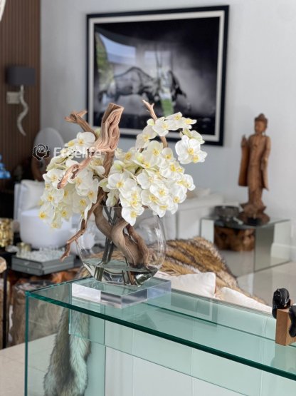 16″ Moon vase with multiple stems of white Phalaenopsis orchids, sand blasted ghost wood and our illusion water.