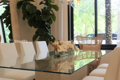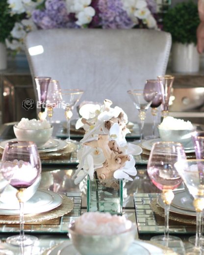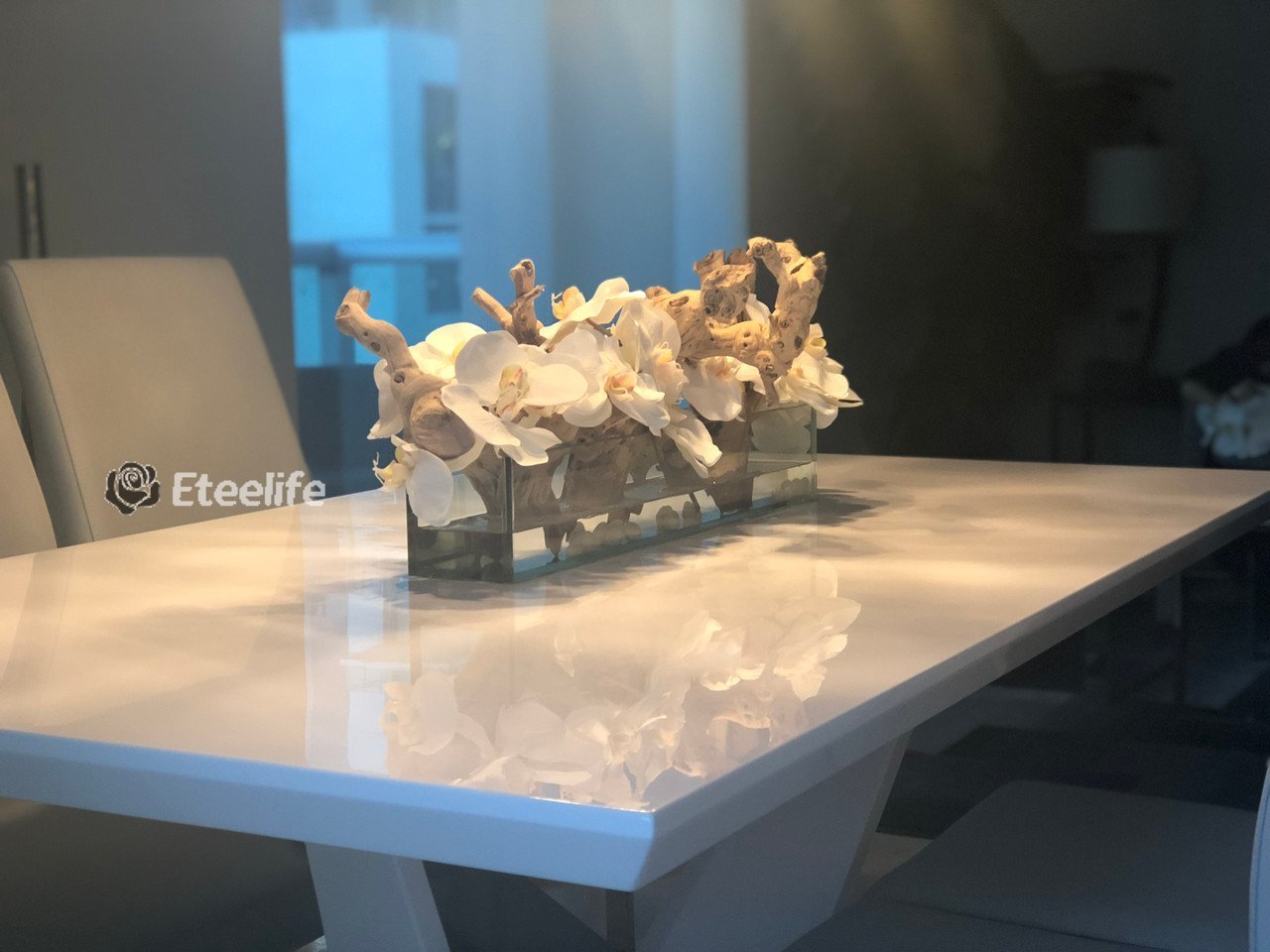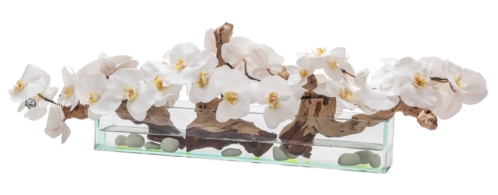 24″ Casa Moderna Glass Plate planter with white Phalaenopsis orchids, sandblasted grape wood, white stones and our illusion water. The stunning sight of a Phalaenopsis orchids in full bloom is nothing less than breathtaking. Their huge, curving petals; double rows of gorgeous blooms march along our casa moderna glass plate planter. This translucent modern glass planter features 90 degree angles and a modern linear design. The sight of a massed display of Phalaenopsis orchids is so arresting that we have paired it with natural sandblasted grape wood to achieve a beautiful and organic contrast.t.