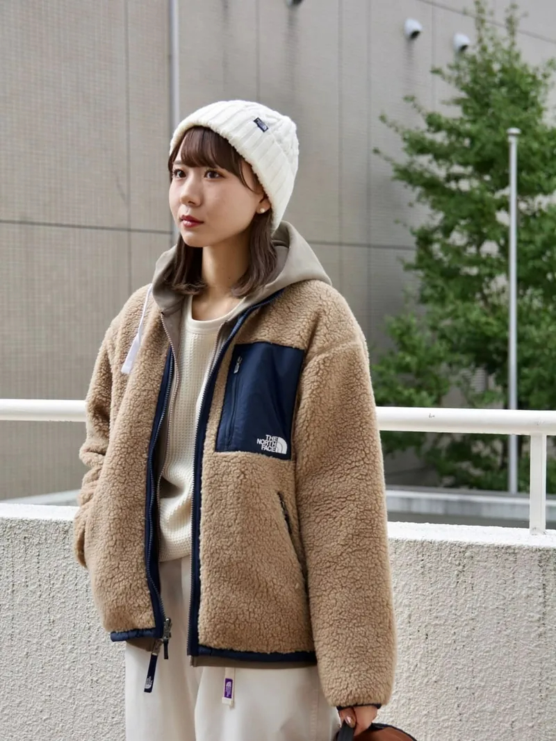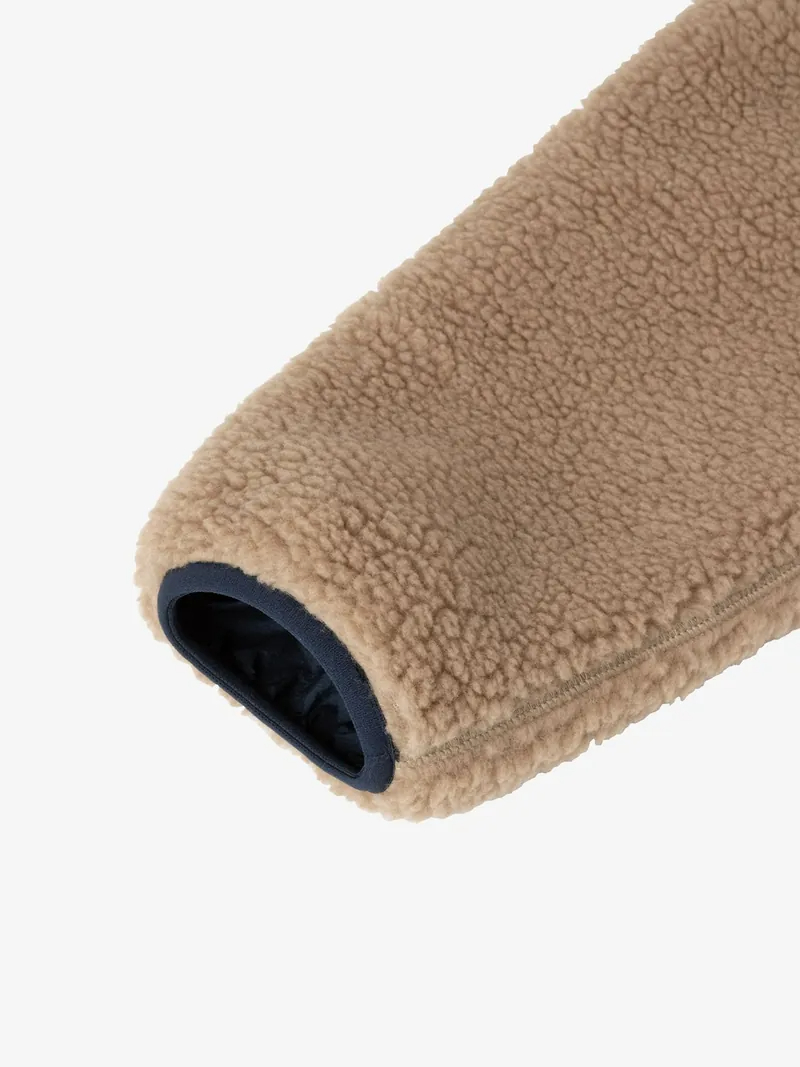 フリース側はリサイクルポリエステルファースカーフで作られており、暖かさをさらに高めています。左胸の編み込みファスナーポケットもデザインのポイントになっています。カラー展開も豊富なシンプルでルーズなシルエットのジャケット。